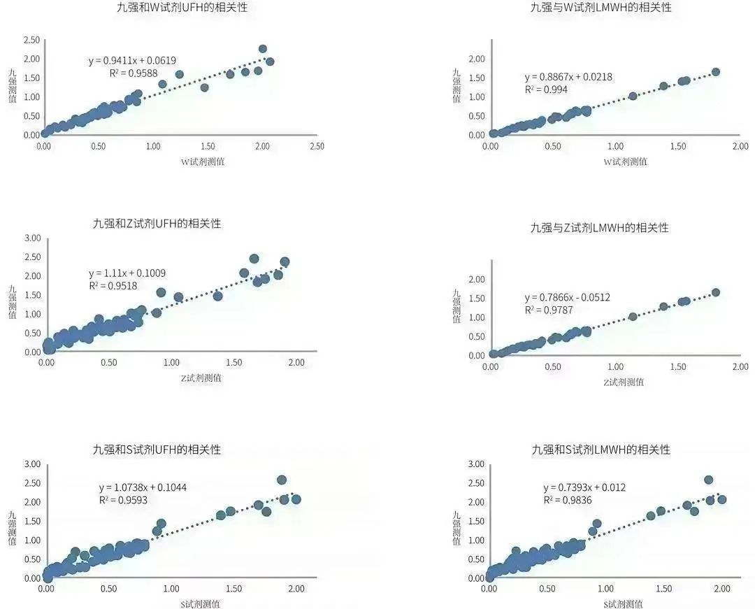 (2)國(guó)產(chǎn)抗Xa試劑可以滿足臨床預(yù)期用途:九強(qiáng)抗Xa試劑盒普通肝素線性可以做到4IU/mL,不僅可以滿足說明書所宣稱的1.2IU/mL,同時(shí)可以滿足臨床上的一些異常特殊高值樣本的檢測(cè)需求;
