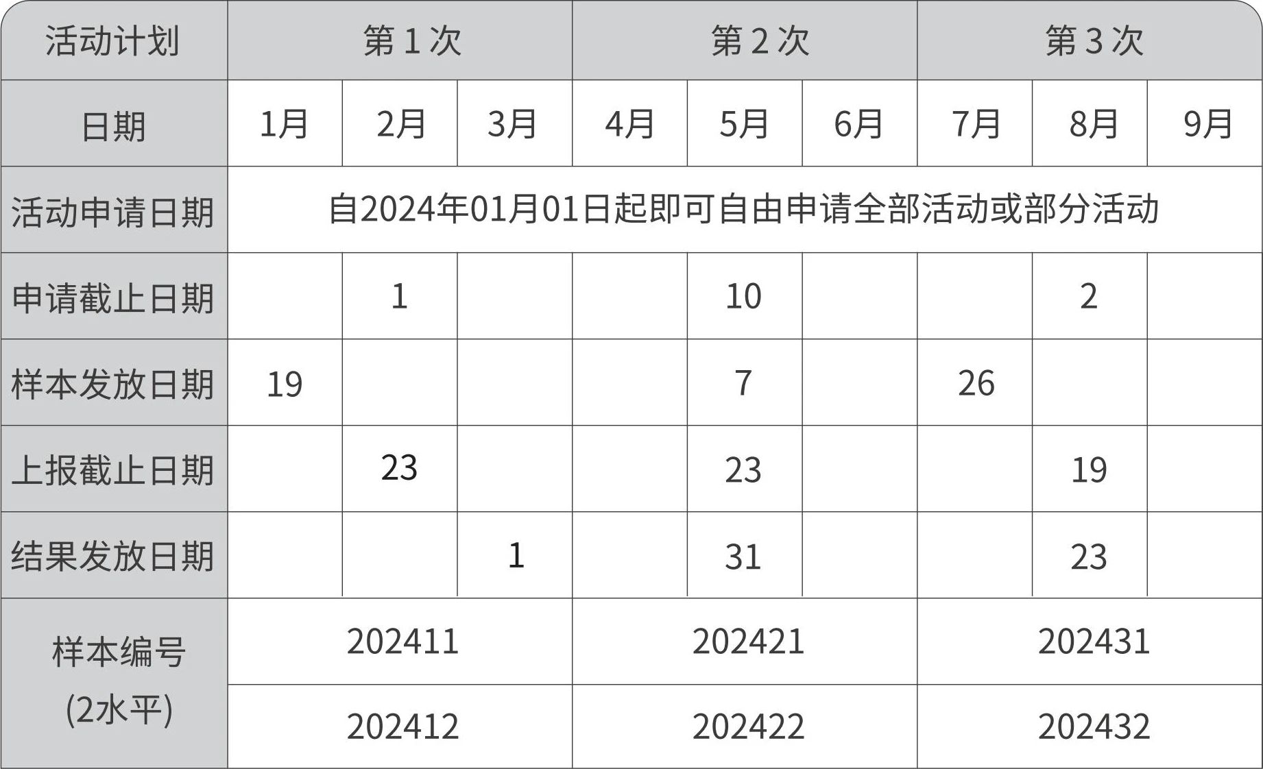 2024年九強(qiáng)生物質(zhì)量評(píng)價(jià)計(jì)劃全年開展3次,每項(xiàng)活動(dòng)每次發(fā)放2個(gè)濃度水平樣本各1支。開展的活動(dòng)及項(xiàng)目具體如下: