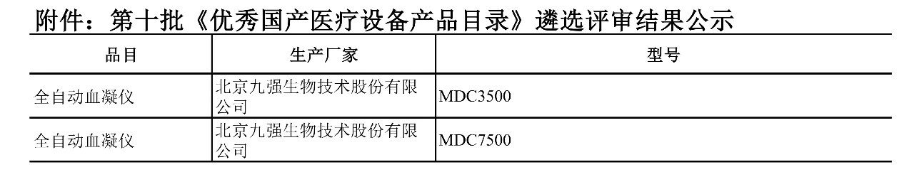 2024年7月30日,中國醫(yī)學(xué)裝備協(xié)會發(fā)布了關(guān)于第十批《優(yōu)秀國產(chǎn)醫(yī)療設(shè)備產(chǎn)品目錄》 遴選評審結(jié)果的公示,九強(qiáng)生物全自動凝血分析儀MDC7500和MDC3500經(jīng)過多次審查和嚴(yán)格篩選,成功入選該目錄。