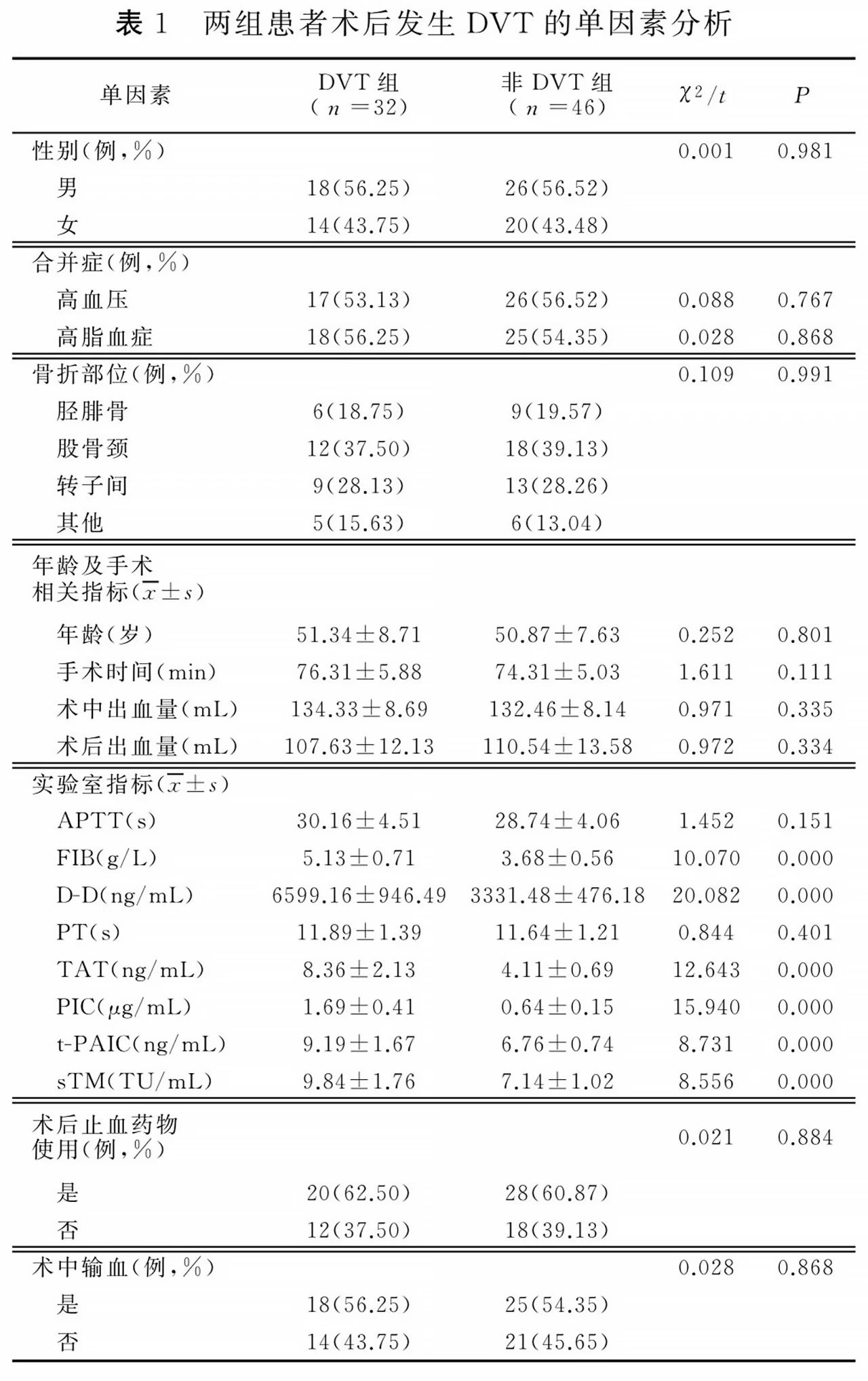 兩組患者術(shù)后發(fā)生DVT的單因素分析