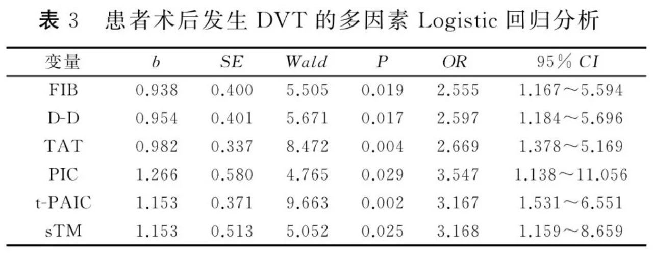 本次研究顯示,DVT組FIB、D-D、TAT、PIC、t-PAIC、sTM 顯著高于非DVT組,提示FIB、D-D、TAT、PIC、t-PAIC、STM可能與創(chuàng)傷性骨折患者術(shù)后DVT風險有關(guān)。