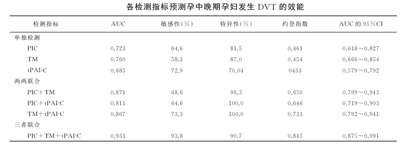 為了降低產(chǎn)前和產(chǎn)后出血的風(fēng)險(xiǎn),并在妊娠和分娩期間維持胎盤功能,生理高凝狀態(tài)伴隨著整個(gè)妊娠時(shí)間,然而過度的高凝狀態(tài)極易并發(fā)妊娠期VTE。沈劼等研究表明Caprini評分與靜脈血漿TM、TAT、t-PAIC、PIC水平對剖宮產(chǎn)術(shù)后DVT形成風(fēng)險(xiǎn)有較好的預(yù)測價(jià)值,提示臨床可根據(jù)新血栓四項(xiàng)水平早期采取措施預(yù)防術(shù)后DVT的發(fā)生。王宇等研究表明TM、TAT、t-PAIC、PIC為影響孕中晚DVT發(fā)生的獨(dú)立預(yù)測因子,新血栓四項(xiàng)聯(lián)合檢測對孕中晚期孕婦發(fā)生DVT的預(yù)測價(jià)值明顯優(yōu)于各單項(xiàng)指標(biāo)檢測或兩兩聯(lián)合(P<0.05),提示聯(lián)合檢測可為臨床早期診治提供參考,見下表。