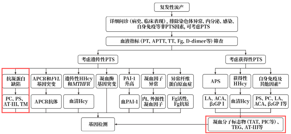 新血栓標(biāo)志物對PTS有重要提示意義,《復(fù)發(fā)性流產(chǎn)合并血栓前狀態(tài)診治中國專家共識(2021)》中指出對于RSA合并PTS患者進(jìn)行凝血功能的篩查,除PT、APTT等常用指標(biāo)外,有條件者可開展TAT、TM、PIC等分子標(biāo)志物,以評價(jià)患者體內(nèi)凝血功能及血管內(nèi)皮狀況,如圖1所示?!稄?fù)發(fā)性流產(chǎn)病因檢查專家共識(2022)》中建議有條件者可開展新血栓4項(xiàng)(TM、TAT、t-PAIC、PIC)檢測。
