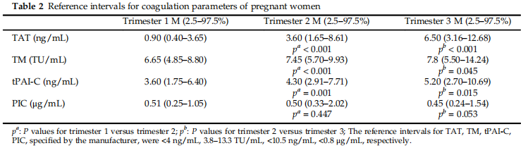 目前絕大多數(shù)實(shí)驗(yàn)室給出的凝血指標(biāo)參考范圍都是非孕期和普通人群,而妊娠期孕婦的血液是處于生理性的高凝狀態(tài),故孕婦不能參照非妊娠人群凝血指標(biāo)的參考區(qū)間,在將血栓四項(xiàng)指標(biāo)普遍用于妊娠期間與血栓性疾病的臨床評估之前,有必要為健康孕產(chǎn)婦建立參考區(qū)間。北京大學(xué)第三醫(yī)院張文靜等老師在《THE JOURNAL OF Obstetrics ancGynaecology Research》發(fā)表的學(xué)術(shù)論文對中國孕婦妊娠期TAT、TM、t-PAIC、PIC的變化及健康孕產(chǎn)婦妊娠期特定參考范圍進(jìn)行了研究。研究納入華北地區(qū)190例健康孕產(chǎn)婦,采用化學(xué)發(fā)光法檢測TAT、TM、t-PAIC和PIC水平,在2.5%和97.5%的分布范圍建立了妊娠期特定參考區(qū)間(結(jié)果見表2)。最終研究表明,TAT、TM、t-PAIC的水平從孕早期(妊娠5-12周)到孕晚期(妊娠28-40周)顯著增加,而PIC的水平并沒有隨著孕周的增加而發(fā)生顯著變化。