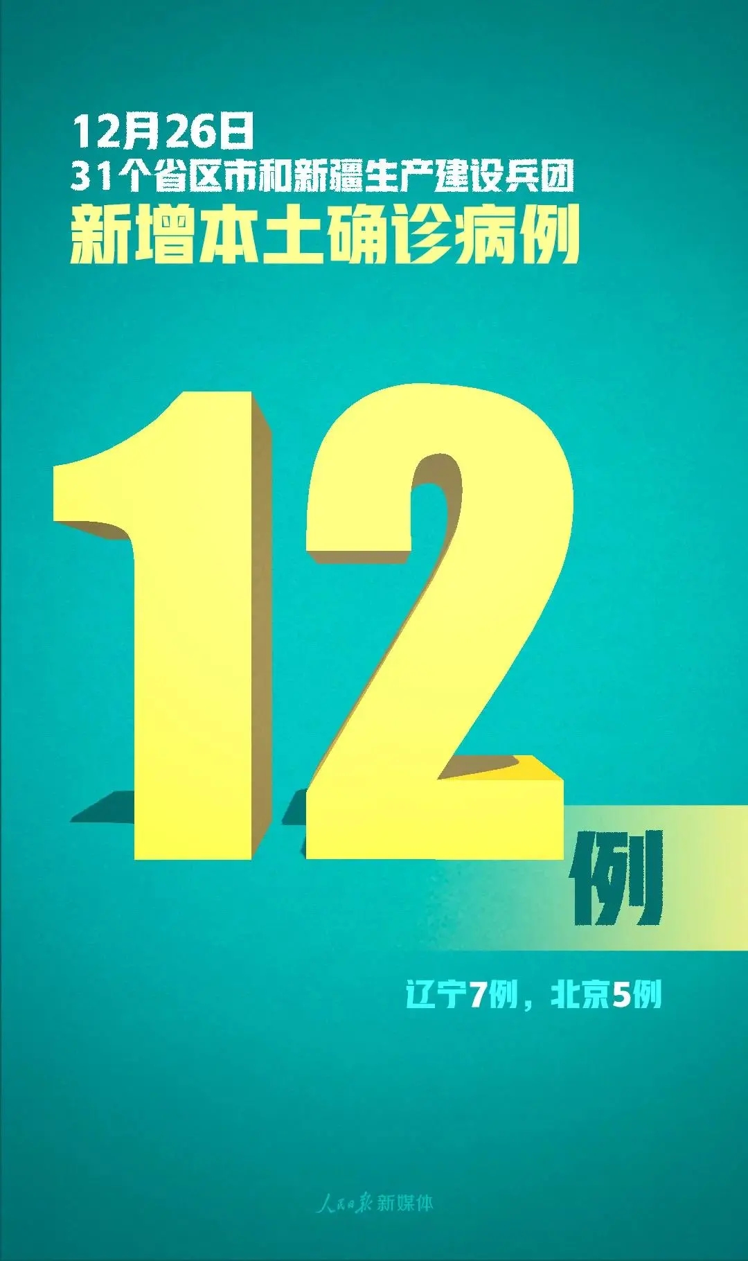 12月26日0—24時(shí),31個(gè)?。ㄗ灾螀^(qū)、直轄市)和新疆生產(chǎn)建設(shè)兵團(tuán)報(bào)告新增確診病例22例,其中境外輸入病例10例(上海4例,北京3例,浙江2例,安徽1例),本土病例12例(遼寧7例,北京5例);無新增死亡病例;無新增疑似病例。